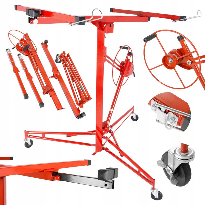 Подъемник устойчивый и мобильный. Сам прибор весит около 30 кг, благодаря оптимально распределённому весу надёжно стоит на полу и является идеальной опорой для гипсокартонных плит.