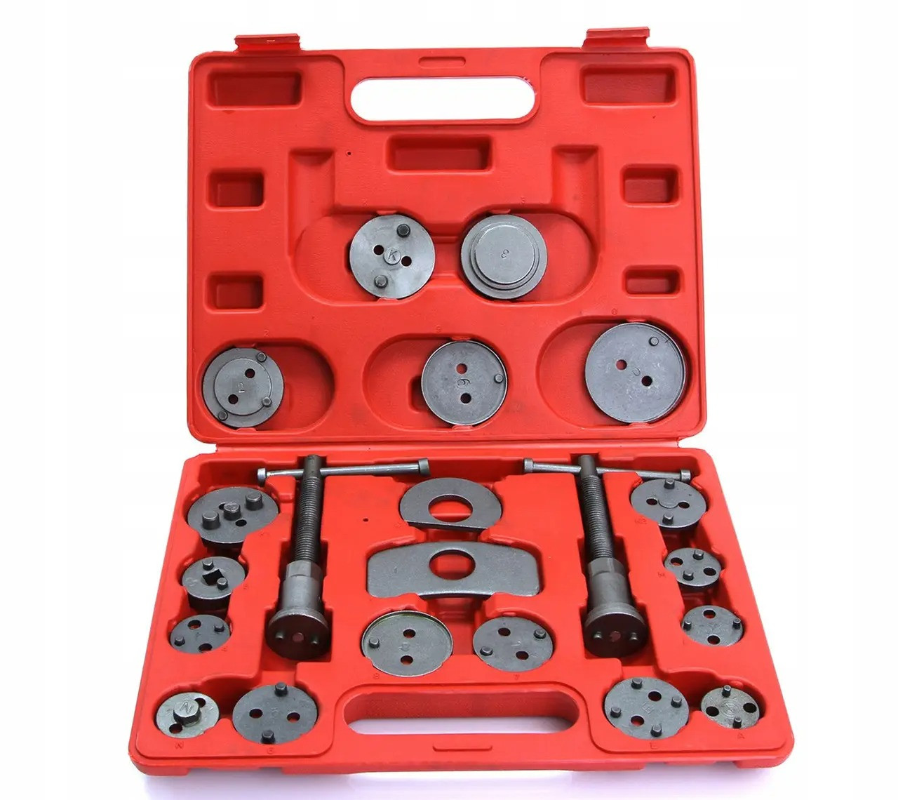 До комплекту входять два преси (правого і лівого кручення), дві балки різної форми для притискання преса до сідла затискача і 17 перехідників. Точна підгонка перехідника і поршня є гарантією правильного встановлення поршня в циліндр гальмівного супорта. Це, своєю чергою, оберігає механіка від заклинювання і заклинювання поршня в циліндрі. Ручка забезпечена магнітним наконечником, завдяки якому утримує пластину, відповідну даному поршню, на осі. Набір рекомендований для загального автосервісу, ідеально підходить для роботи з керамічними поршнями.
